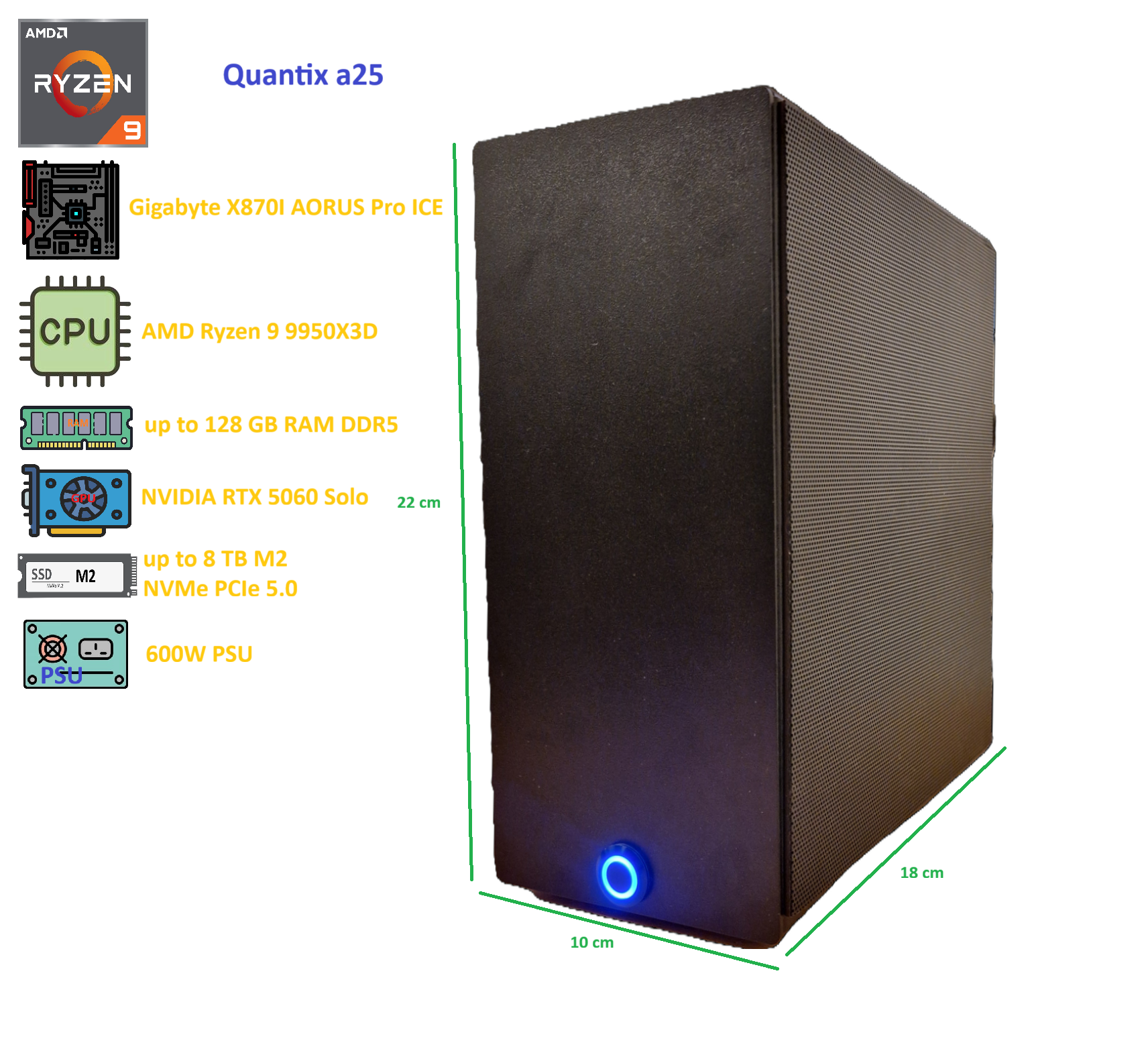 It's powered by an AMD Ryzen 9 9950X3D CPU with 16 physical cores + 16 Virtual Cores and up to 5.7 GHz, with 64 GB or 128 GB RAM DDR5 6000 MHz, the fastest M2 NVMe PCIe 5.0 with 2 TB, 4 TB or 8 TB data capacity (expandable), NVIDIA RTX 5060 Solo PCIe 5.0 x8 with 8 GB VRAM GDDR7, WiFi 7 + Bluetooth and much more!